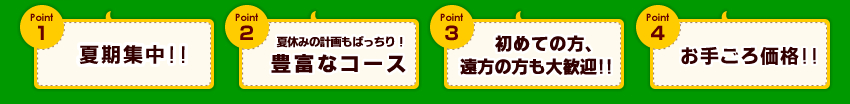 幼児から小中学生まで、幅広い方を対象に、最短3日から最長4週間まで、さまざまなコースをご用意しています。ご要望・ニーズにあったコースがお選びいただけます。